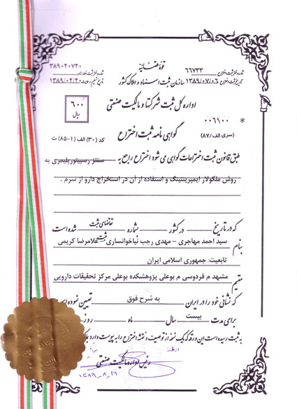 حسنی مریم بدون مجموعه 12 September 2015 Hits: 862 Rating: ( 0 Rating ) Patent User Rating: 0 / 5 Please Rate Vote 1 Vote 2 Vote 3 Vote 4 Vote 5 S.A. Mohajeri, S.A. Sajadi Tabassi, F. Hadizadeh, M. Badinloo, Formulation and evaluation of crocin tablets, 2014. S.A. Mohajeri, F. Hadizadeh, M. Seifi, Separation and purification of lycopene from tomato paste by Ursodeoxycholic Acid Using the Selective Inclusion Complex Method, 2013. S.A. Mohajeri, G. Karimi, M.R. Khansari, Synthesis of polymeric receptor for clozapine using molecular imprinting method and its application in extraction of drug from human serum, 2010. F. Hadizadeh, S.A. Mohajeri, M. Seifi, Extraction and purification of total crocin from saffron, 2009